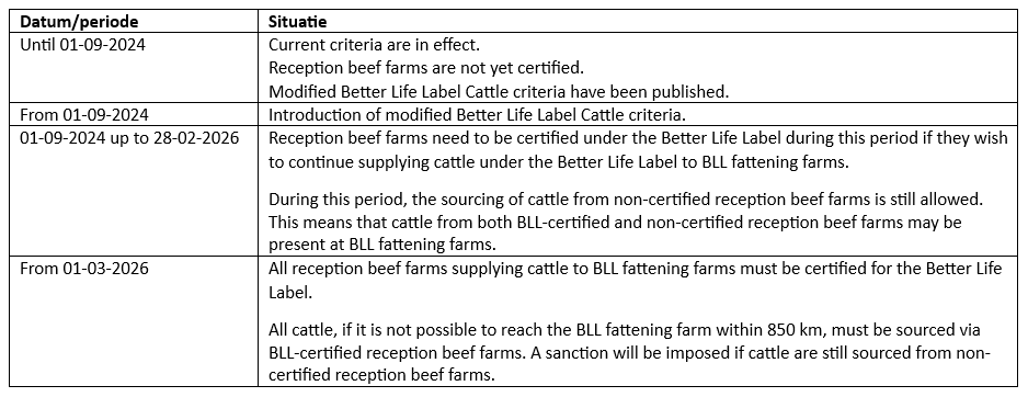Since the BLL certification of the reception beef farms starts from 01-09-2024 and must be completed by 28-02-2026 at the latest, a transitional period applies for the BLL fattening farms that utilize these reception beef farms. This transitional period thus runs from 01-09-2024 to 28-02-2026. During this transitional period, it is still permitted to bring in cattle from non-certified reception beef farms.